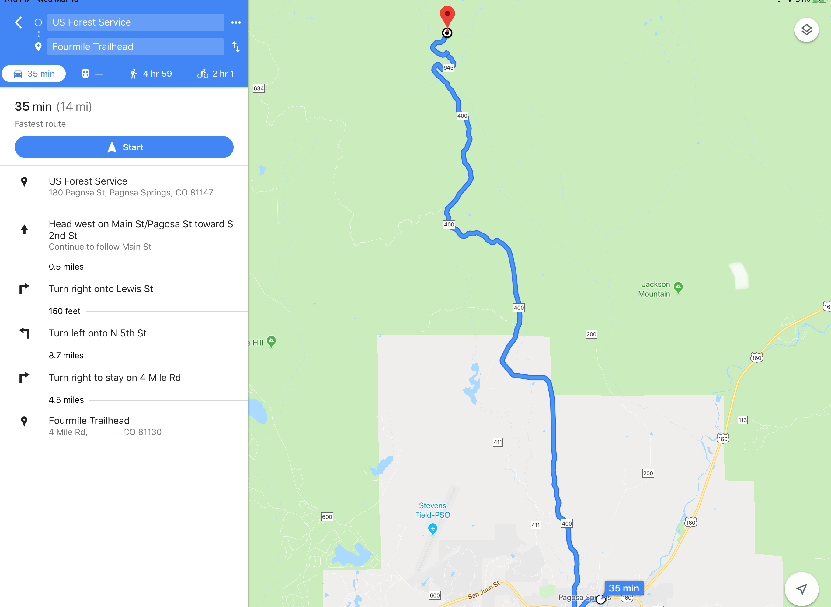 Driving Directions: From US 160, turn north onto Lewis Street and take an immediate left onto 5th Street. Stay right on Fourmile Road (CR 400 which will turn to FS 645). Drive north 8.4-miles before turning right at the junction. Continue 4.6-miles to a shared Trailhead with the Anderson Trail.