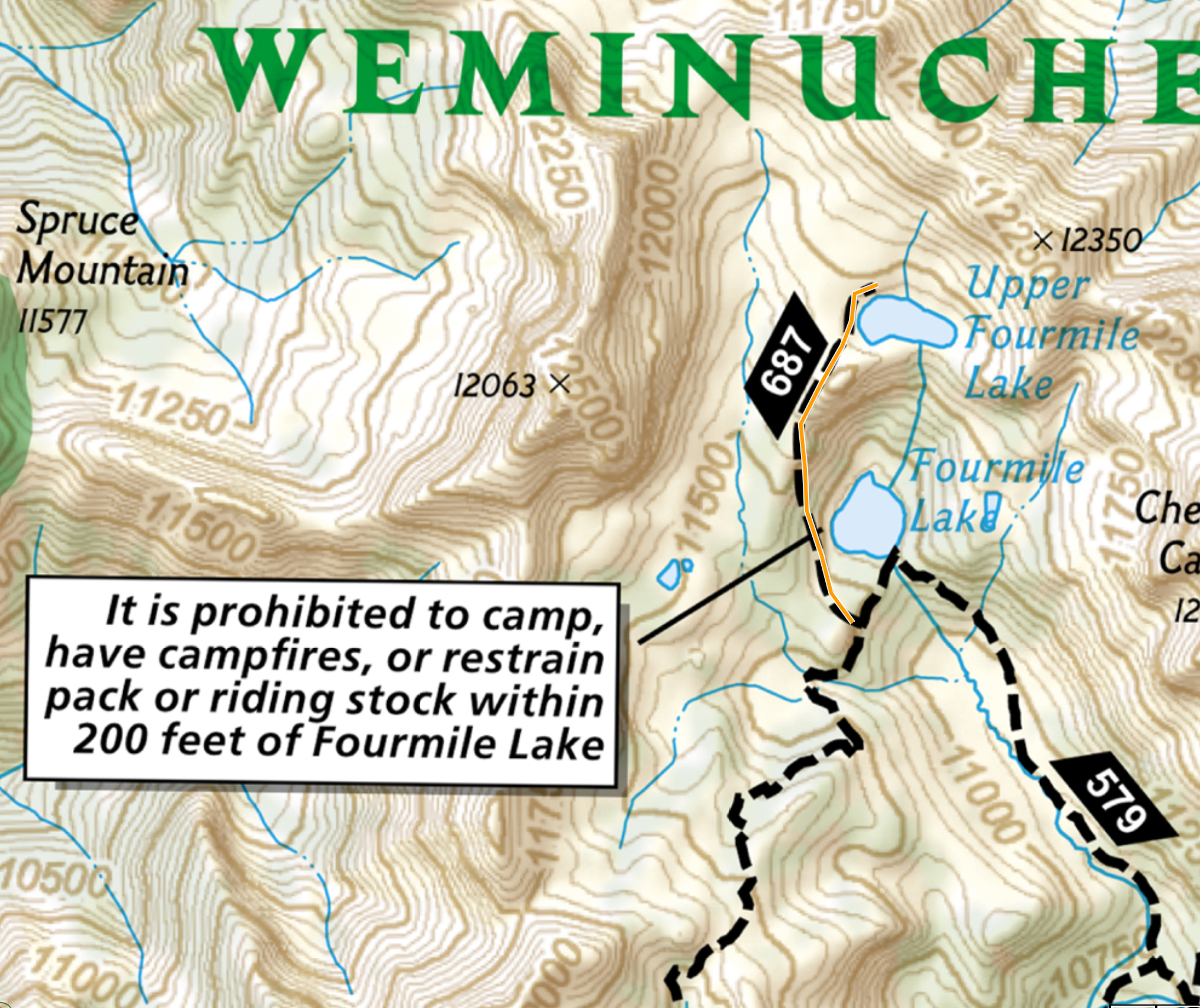 It is prohibited to camp, have campfires or retrain pack or stock within 200 feet of Fourmile Lake.