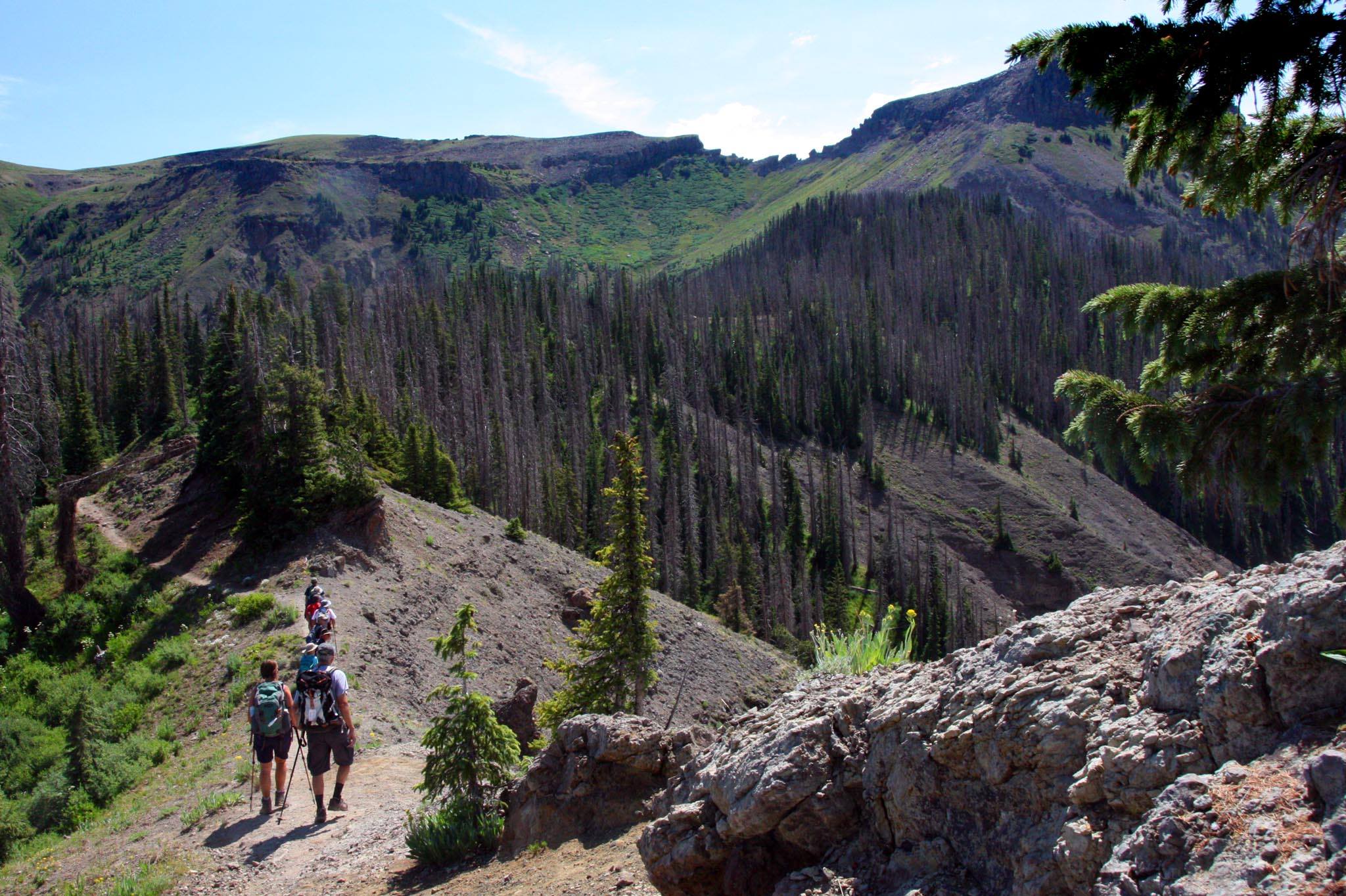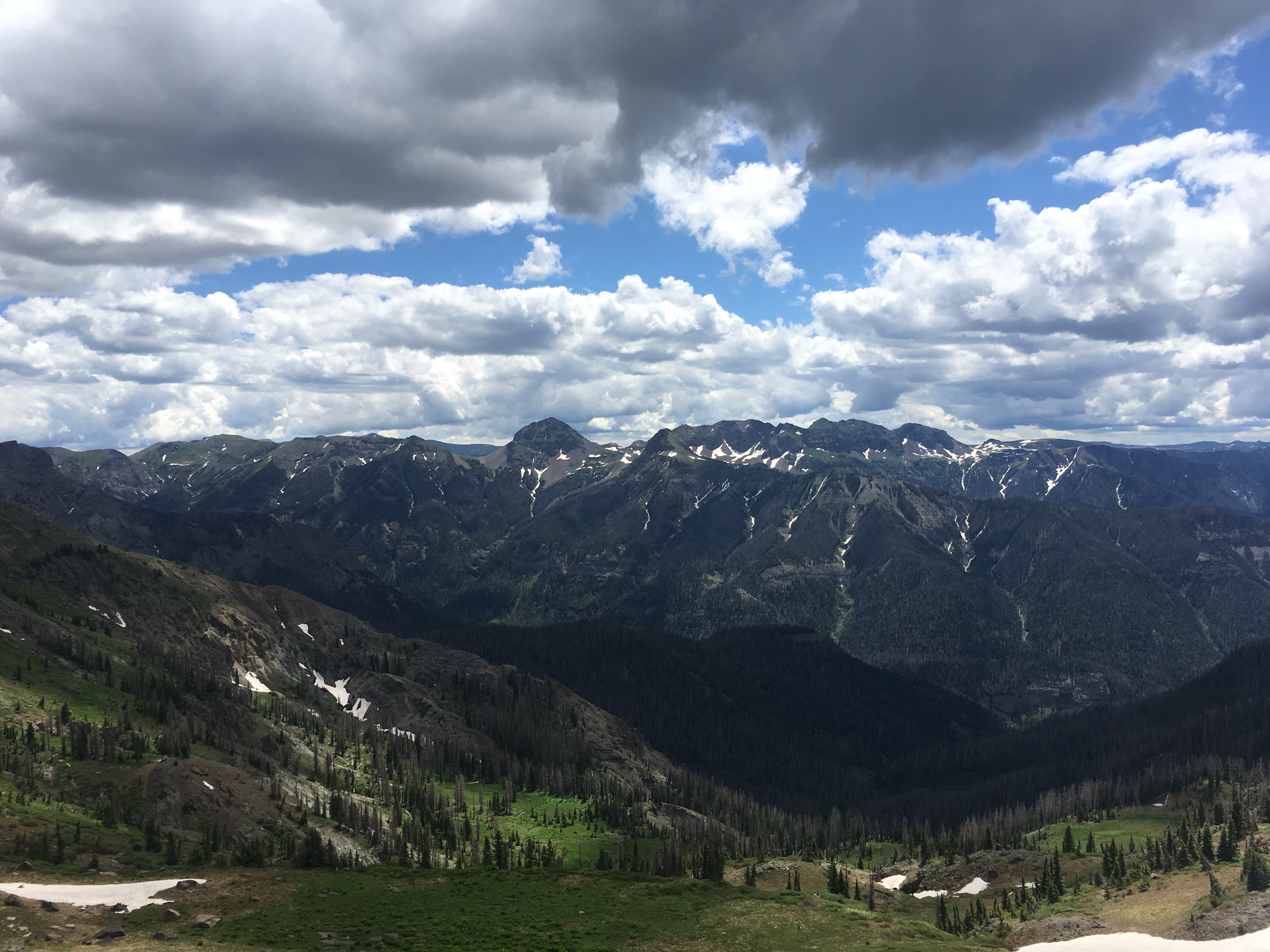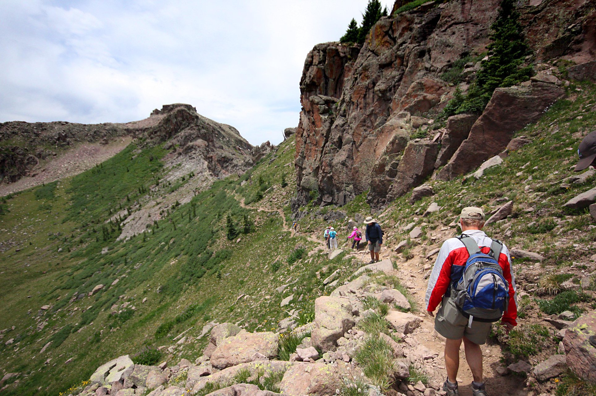 Short Trail Summary: This trail usually has great flowers and fine views; it is suitable for dogs. This description is to the junction with the Quartz Creek Trail No. 571. From the trailhead, begin climbing initially through meadows and aspen forest. The trail begins to switchback with occasional views of Square Top, Nipple Mountain and Blackhead Peak. Once on the ridge, there are views of these plus Sand Mountain to the north. There is a steep, side-hill climb to Quartz Ridge and the Keyhole (also known as the “window”). The Keyhole is a good destination for a day hike being 3.0 miles (one-way) and 2050 vertical feet. From here, the terrain changes dramatically. If you are feeling good and the weather is cooperating, one can cross to the other side of the ridge, but be careful as there is a short section that is steep with poor footing (sit on your butt if unsure). There is a great lunch spot only ¼-mile past the Keyhole with a fine view of the South San Juan’s. Continuing on, at the junction with Quartz Lake Trail No. 568, turn east and descend to Middle Earth on spectacular trail construction consisting of rebar and cable done with special permission after becoming a designated wilderness area. From junction it is 1 mile to Quartz Lake with a descent of 470 ft. Soon pass Blanco River Trail No. 573 on the south. Continue with occasional clear tread along an undulating up and down traverse to the saddle of the 12,245-foot Quartz Creek Trail junction.