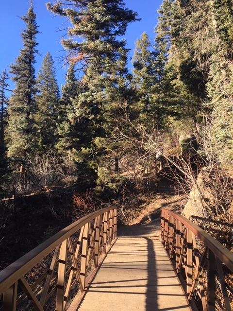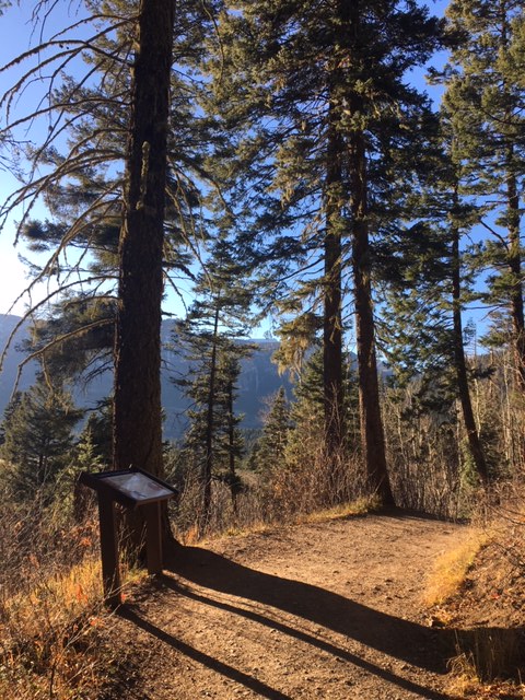 Trail Summary: Short, accessible interpretive trail located on Highway 160 is a very popular stop along Highway 160. Trail begins on left side of parking lot. After a short uphill walk, a spur trail to the left leads to Valley View overlook; go right to continue to falls. Follow the trail through the forest to a second spur leads to Misty Deck at the base of the falls or go right to cross a footbridge with a great view of the 100’ waterfall. On return to the parking lot, please heed signs not to shortcut between loops of the trail.