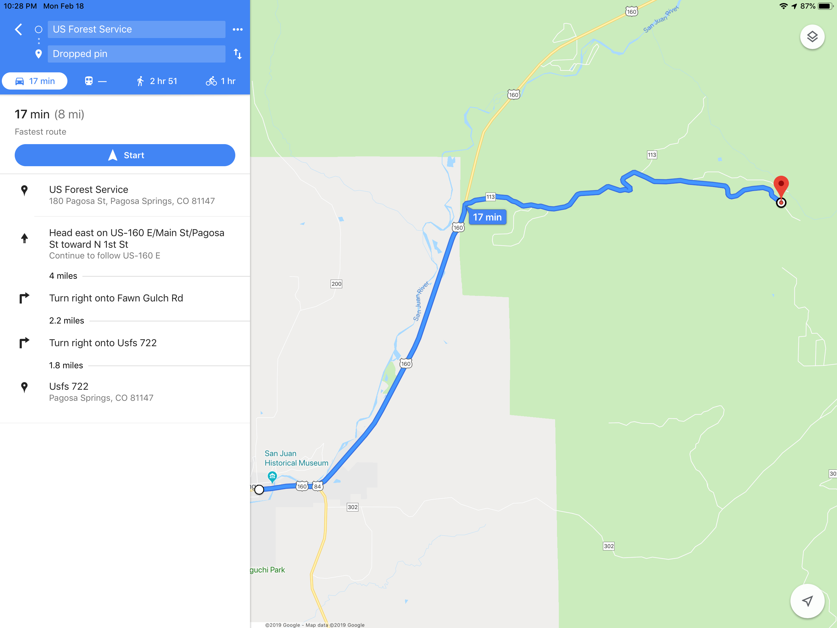 Fawn Gulch Trailhead Driving Directions: From US 160/US 84 junction, continue east for 4-miles. Turn south onto Fawn Gulch Road (FS 662). Continue for 4.2-miles to the trailhead on the east side of the road. Ample parking.