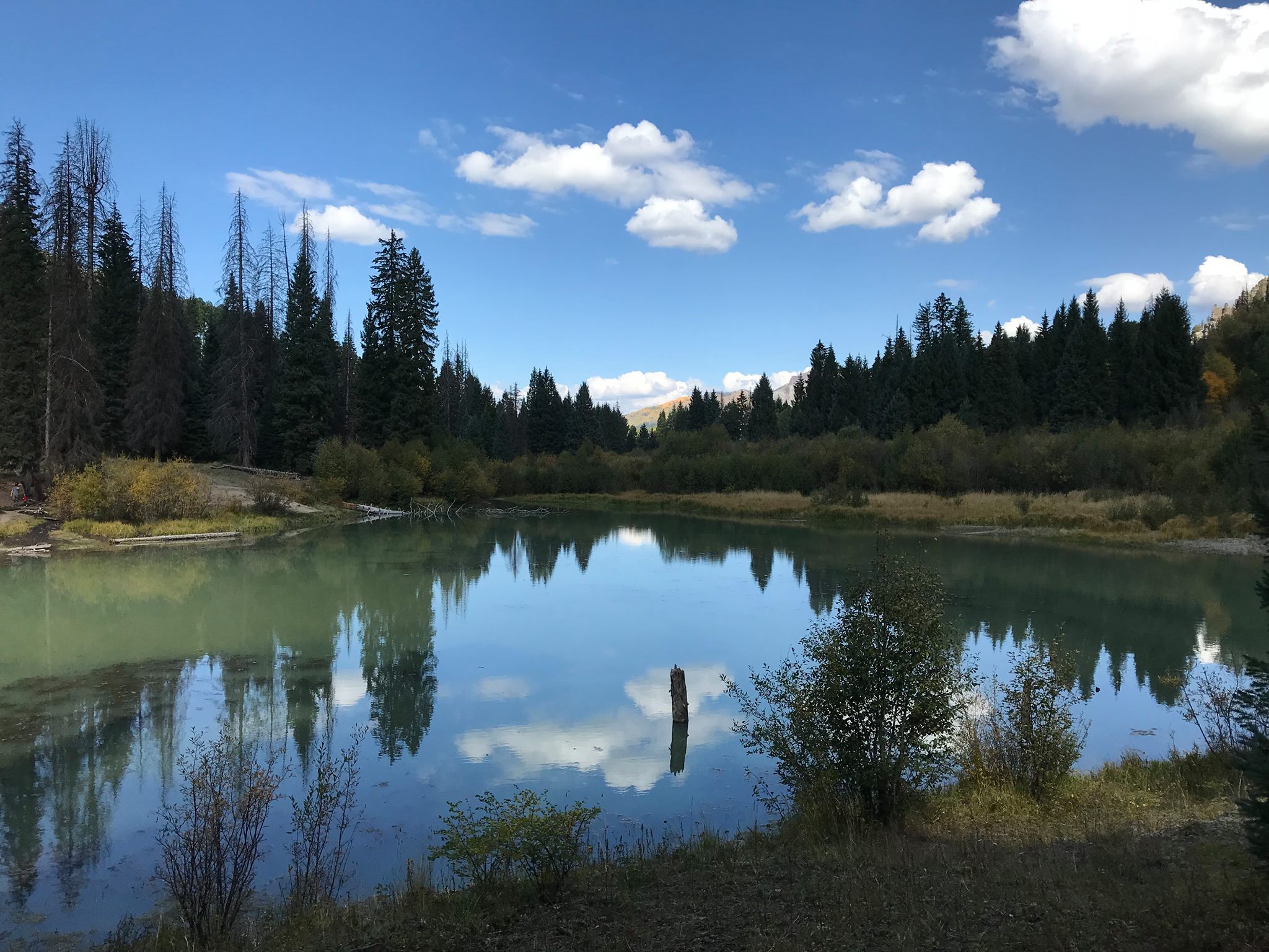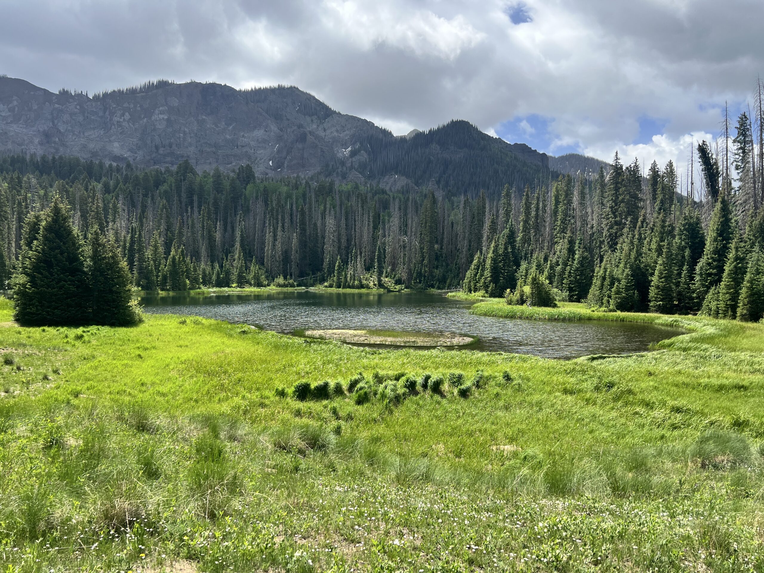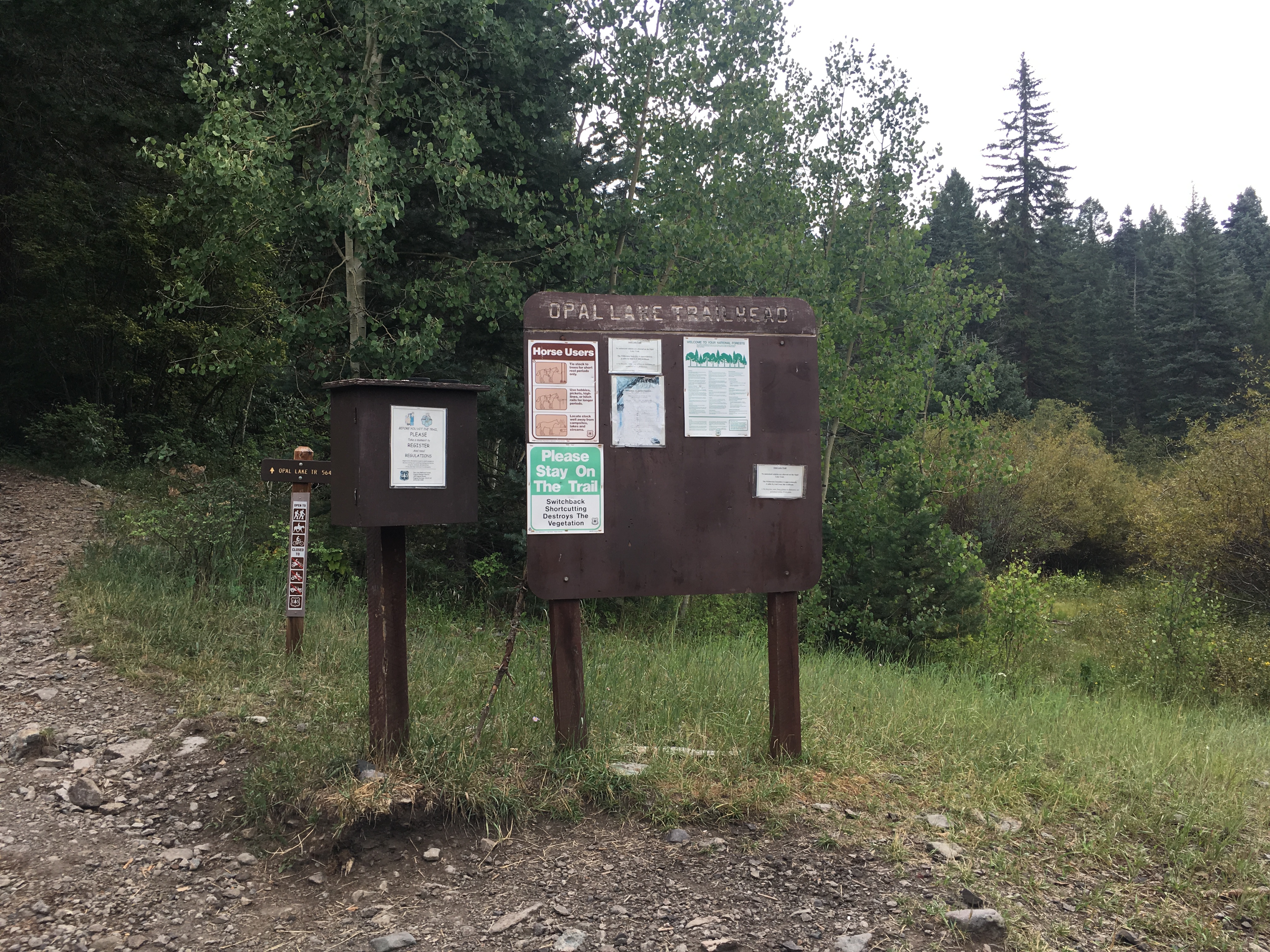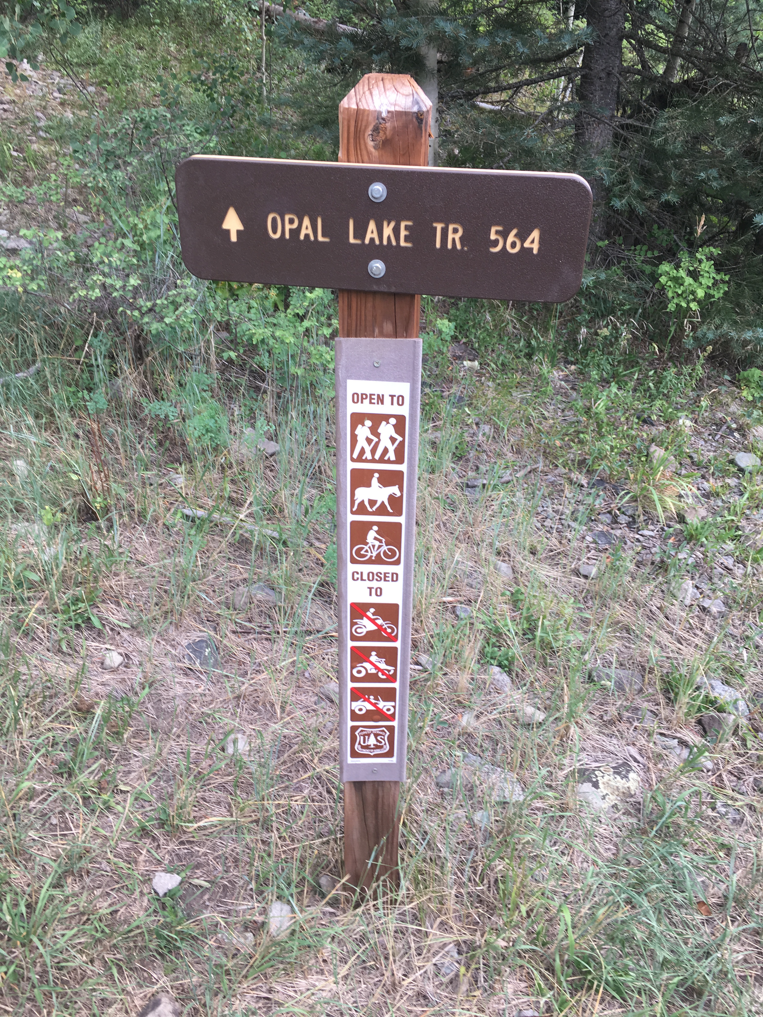 The trail passes through stands of aspen and a mixed forest of spruce and fir. Small meadows with abundant skunk cabbage are the first buds of the season. Before reaching the lake you will see an intersection with the Fish Creek Trail #575 on your left and then at 1.1 miles another intersection with a trail leading off to the right. This right turn will take you toward No Name (Lizzie Lake). continuing straight at this intersection for a short distance will get you to Opal Lake.